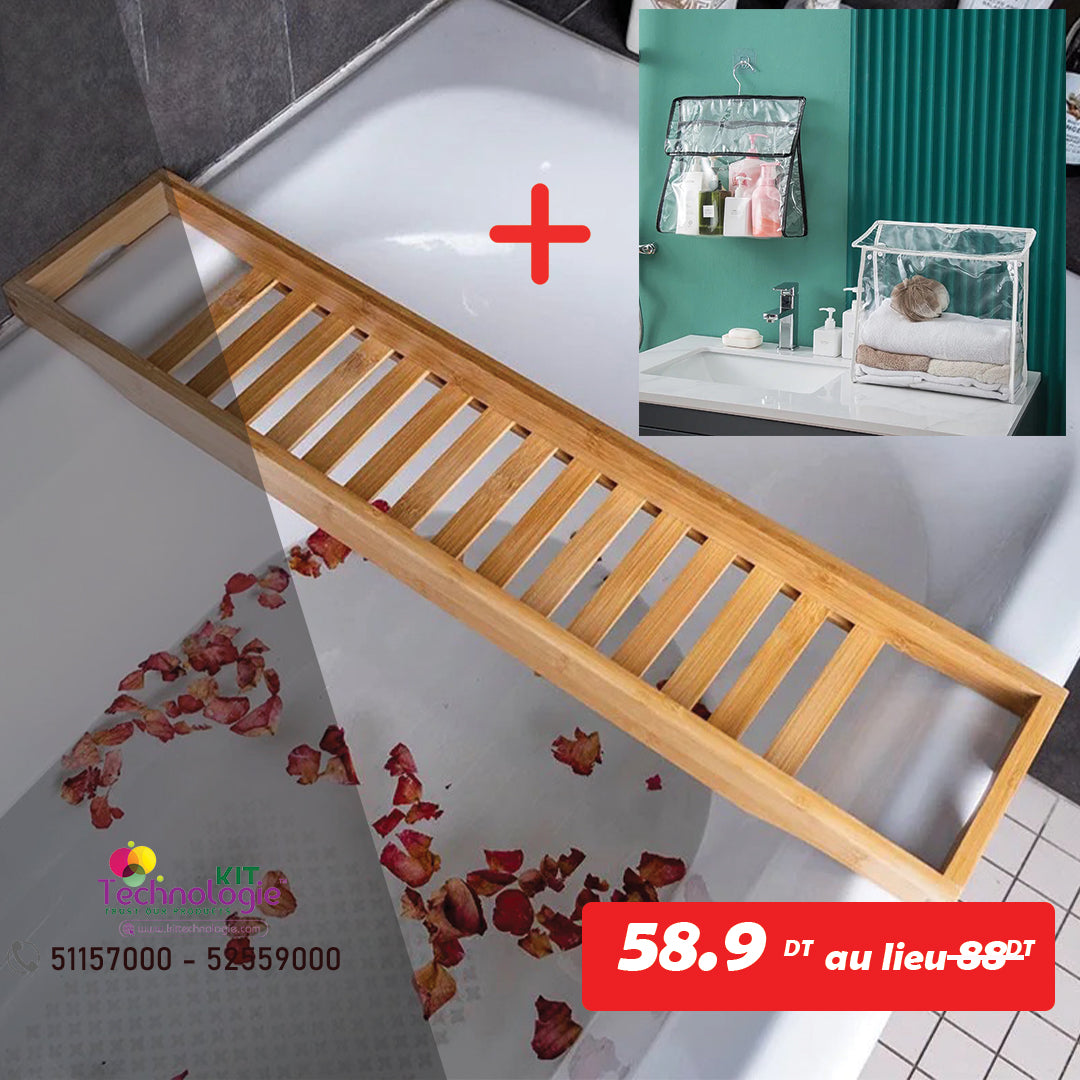 Ce Pack Luxury Bathroom se compose de 2 Produits : Plateau de baignoire en bambou + Sac de Rangement pour Salle de Bain