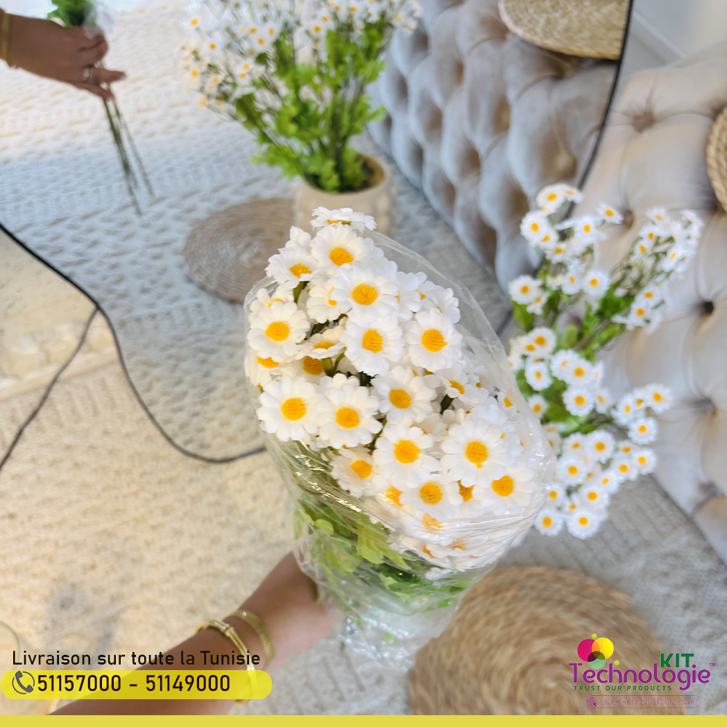 .La combinaison de leurs pétales blancs et jaunes éclatants, associée à des tiges vertes robustes, crée une ambiance lumineuse et joyeuse, parfaite pour égayer un salon, une table ou même un bureau.
